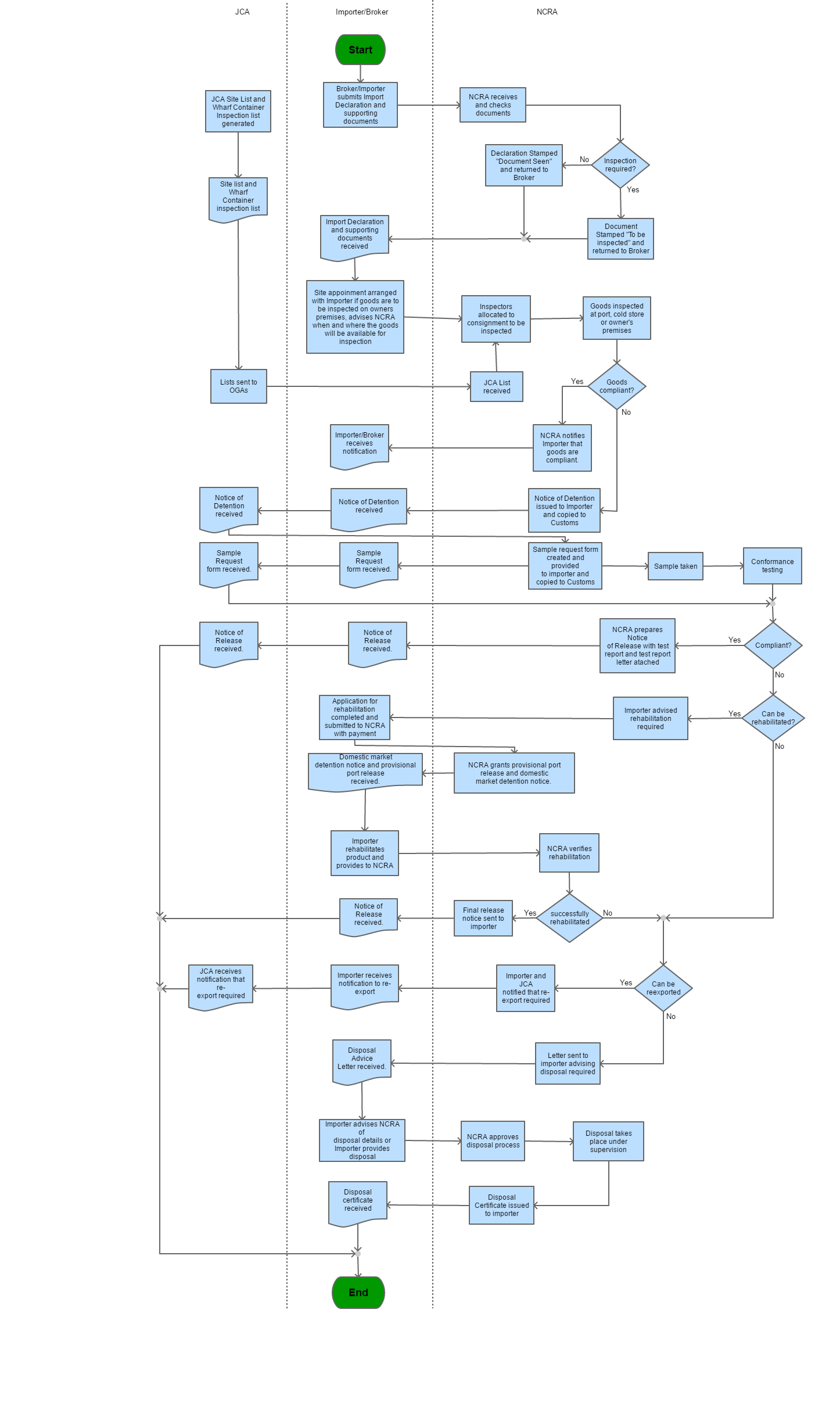 If goods are compliant after testing i) Importer and JCA notified that re-exported required ii) Importer receives notification for re-export iii) JCA receives notification that re-exported required If goods cannot be re-exported then: i) Letter sent to importer advising disposal ii) Disposal Advice Letter received iii) Importer advises disposal details to NCRA iv) NCRA agree to disposal process v) Disposal takes place under the supervision vi) Disposal Certificate issued to the importer vii) Disposal certificate received |